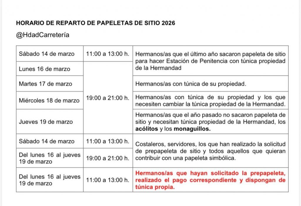 Rogamos, en la medida de lo posible, que la solicitud se realice telemáticamente y dentro de las fechas indicadas, para agilizar la entrega de las papeletas de sitio.